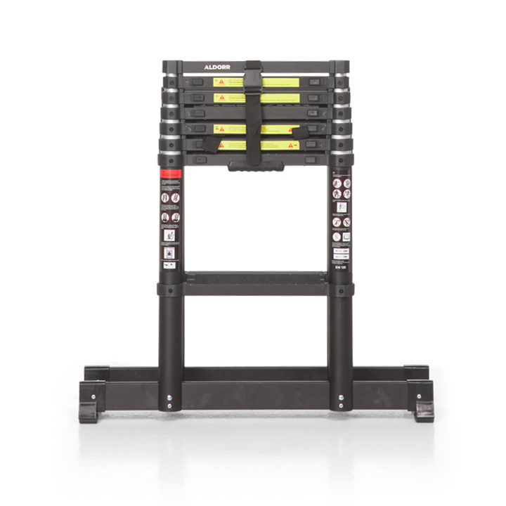 Die ALDORR Professional teleskopische Klappleiter Die ALDORR Professional teleskopische Klappleiter ist eine robuste Leiter aus eloxiertem Aluminium mit einer langlebigen schwarzen Schutzbeschichtung. Sie besteht aus 2 Teilen mit jeweils 6 Stufen. Die Leiter kann als freistehende Leiter in A-Form verwendet werden. Der breite Stabilisierungsbalken von 90 cm sorgt für zusätzlichen Halt und Komfort während der Benutzung. Die teleskopische Klappleiter ist mit einem sicheren Soft-Close-Mechanismus ausgestattet. Dadurch gleiten die Stufen langsam und kontrolliert ein, sodass Ihre Finger nicht eingeklemmt werden können. Zudem ist die Leiter mit Indikatoren ausgestattet, die für jede Stufe anzeigen, ob sie vollständig verriegelt und sicher zu betreten…