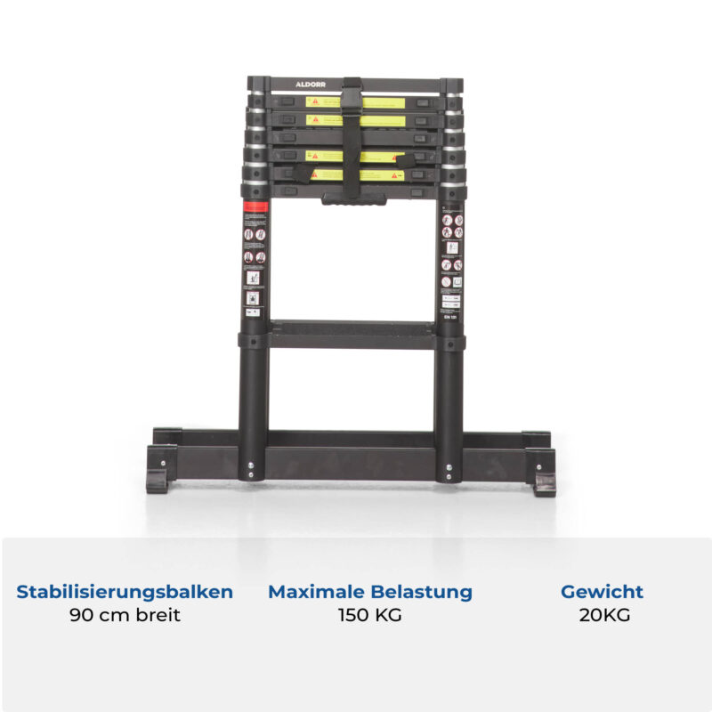 Die ALDORR Professional teleskopische Klappleiter ist eine robuste Leiter aus eloxiertem Aluminium mit einer langlebigen schwarzen Schutzbeschichtung. Sie besteht aus 2 Teilen mit jeweils 6 Stufen. Die Leiter kann als freistehende Leiter in A-Form verwendet werden. Der breite Stabilisierungsbalken von 90 cm sorgt für zusätzlichen Halt und Komfort während der Benutzung.