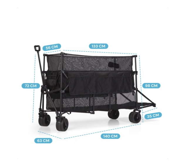 Dank des großzügigen Fassungsvermögens von 600 Litern und einer Tragkraft von 300 kg brauchen Sie sich keine Sorgen mehr um Platzmangel zu machen. Ob am Strand, im Park oder auf dem Campingplatz – dieser faltbare Bollerwagen bietet ausreichend Stauraum für alles, was Sie brauchen. Mit den geländetauglichen PU-Rädern inklusive Vorderradbremse ist kein Untergrund zu herausfordernd.